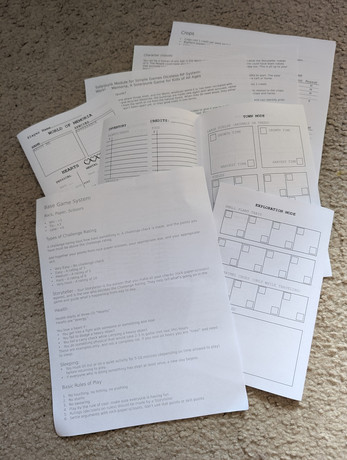 This Simple Games Diceless RP System is made for younger kids to be able to hopefully understand and play either as a tabletop game or a playground live action role play, using rock-paper-scissors only. Of course, that does not preclude grown-ups from playing as well. Included is: